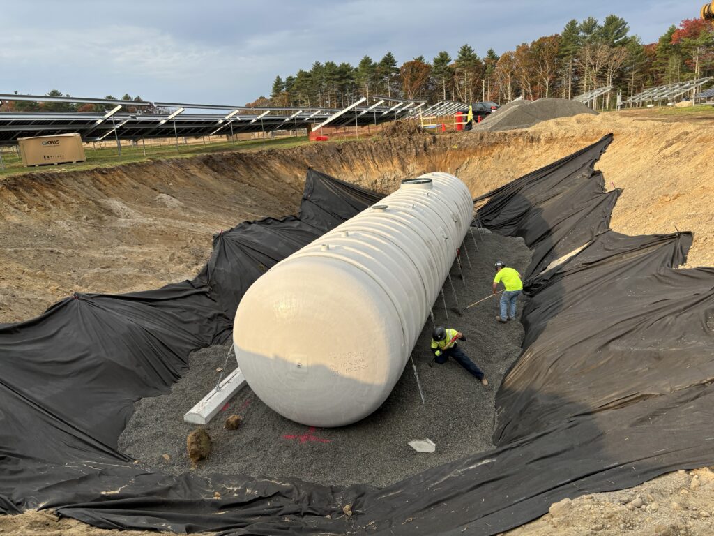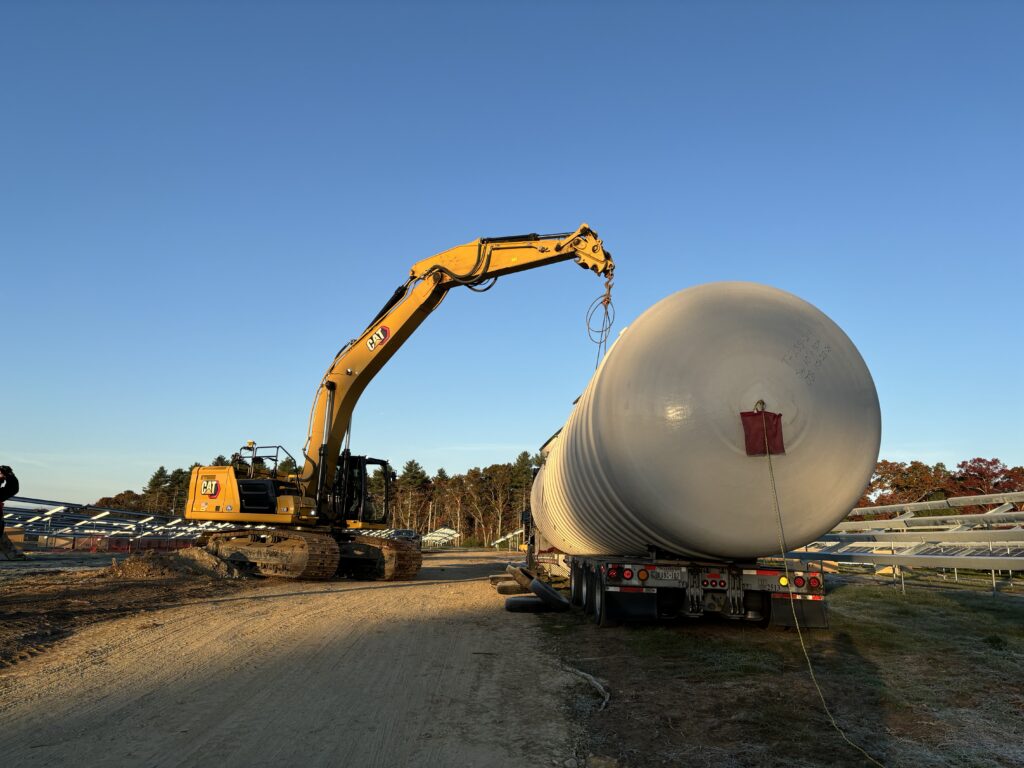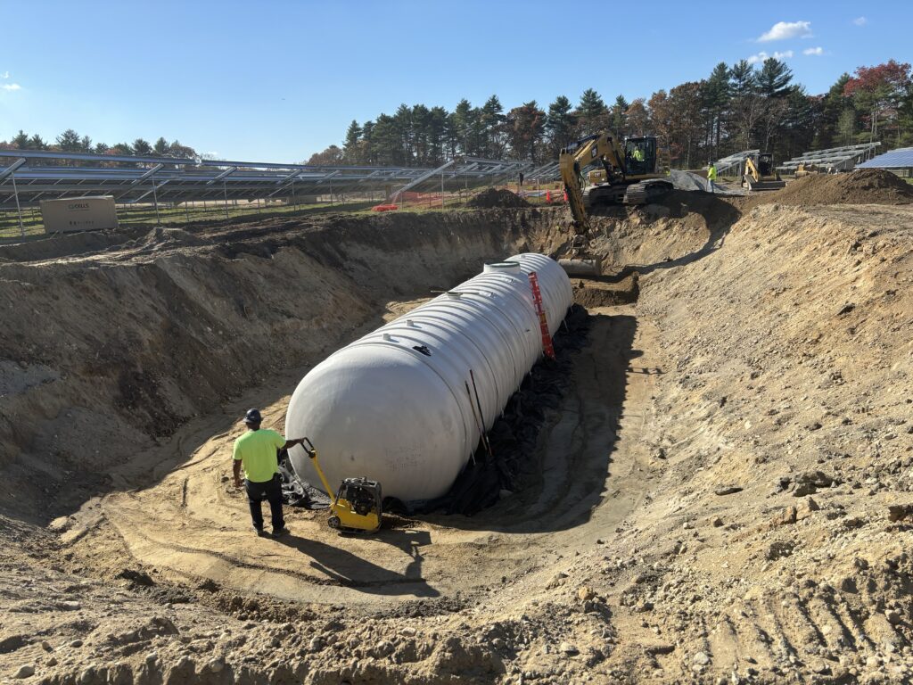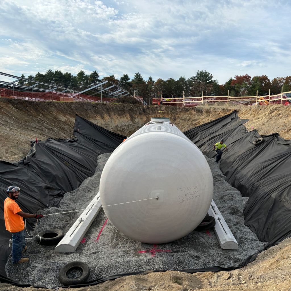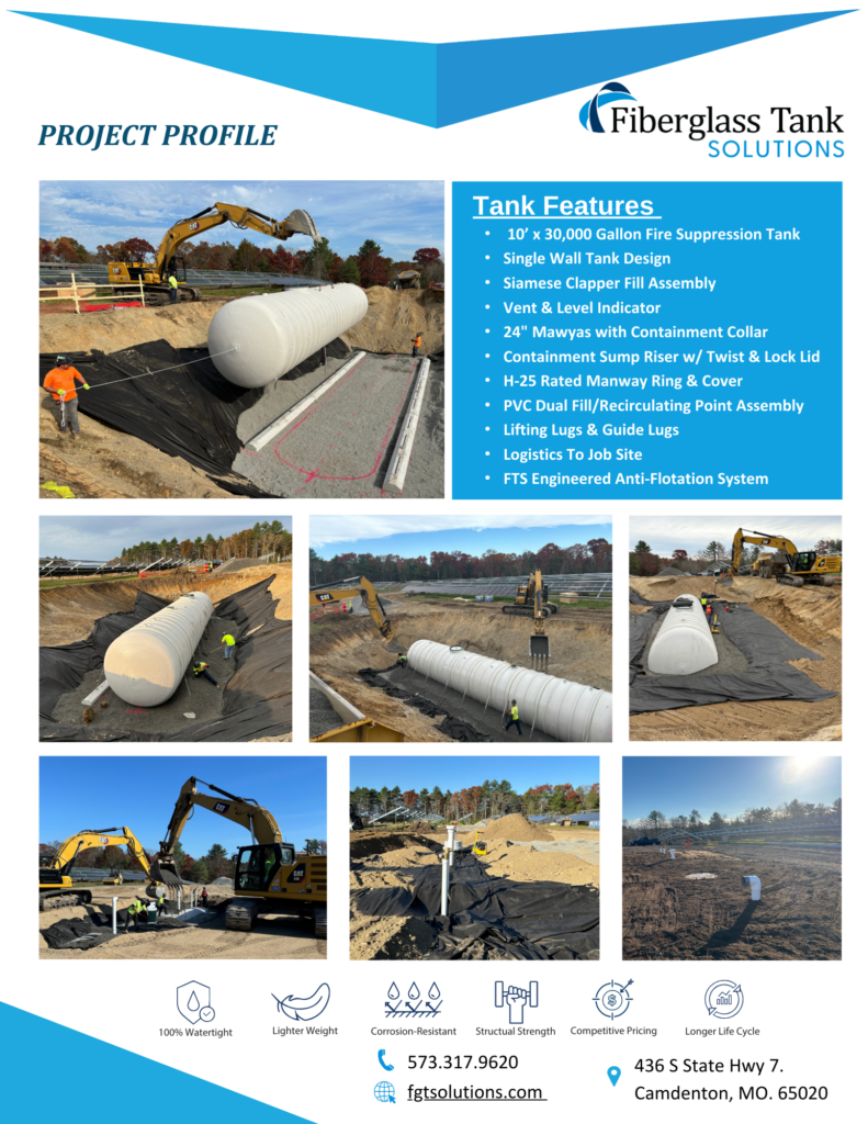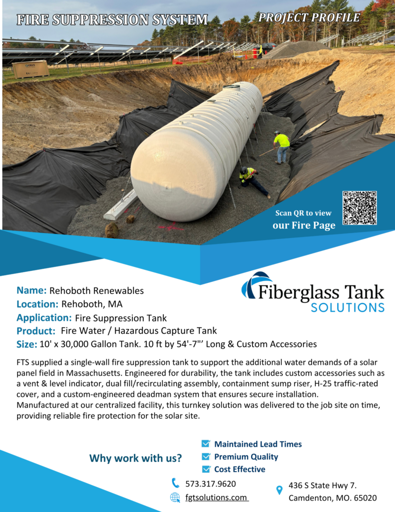 Project Description: As solar energy facilities expand across the nation, so do the fire protection requirements for these critical renewable infrastructure sites. FTS engineered and delivered a specialized fire suppression water storage solution for Rehoboth Renewables’ solar panel field in Massachusetts—addressing the unique challenges of protecting remote renewable energy installations. This single-wall underground fiberglass tank provides 30,000 gallons of dedicated fire protection water supply, designed to meet the additional demand requirements of large-scale solar arrays. The system features a complete package of custom-engineered accessories, including vent and level monitoring, dual fill and recirculating assembly for water quality maintenance, containment sump riser for leak detection, and an H-25 traffic-rated cover capable of withstanding heavy equipment loads during construction and maintenance operations. A custom-engineered deadman anchoring system ensures the tank remains secure in all soil conditions. Manufactured at our centralized facility and delivered turnkey to the remote solar site, this solution provides decades of reliable fire protection for Massachusetts’ growing renewable energy infrastructure.