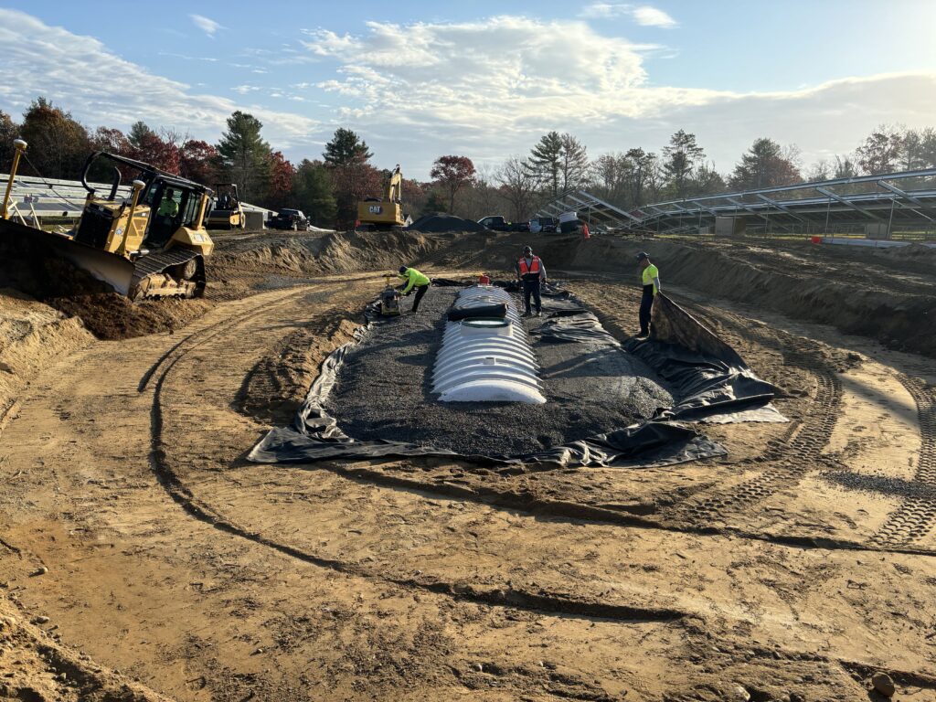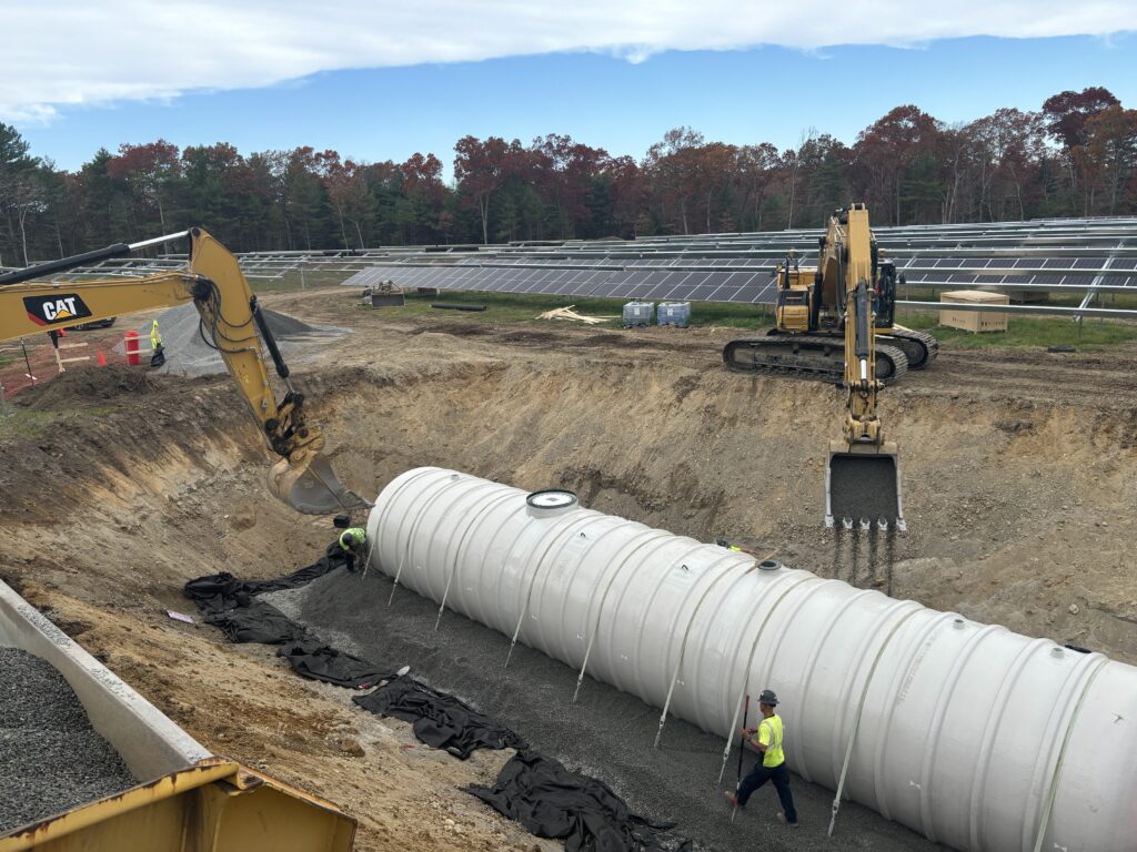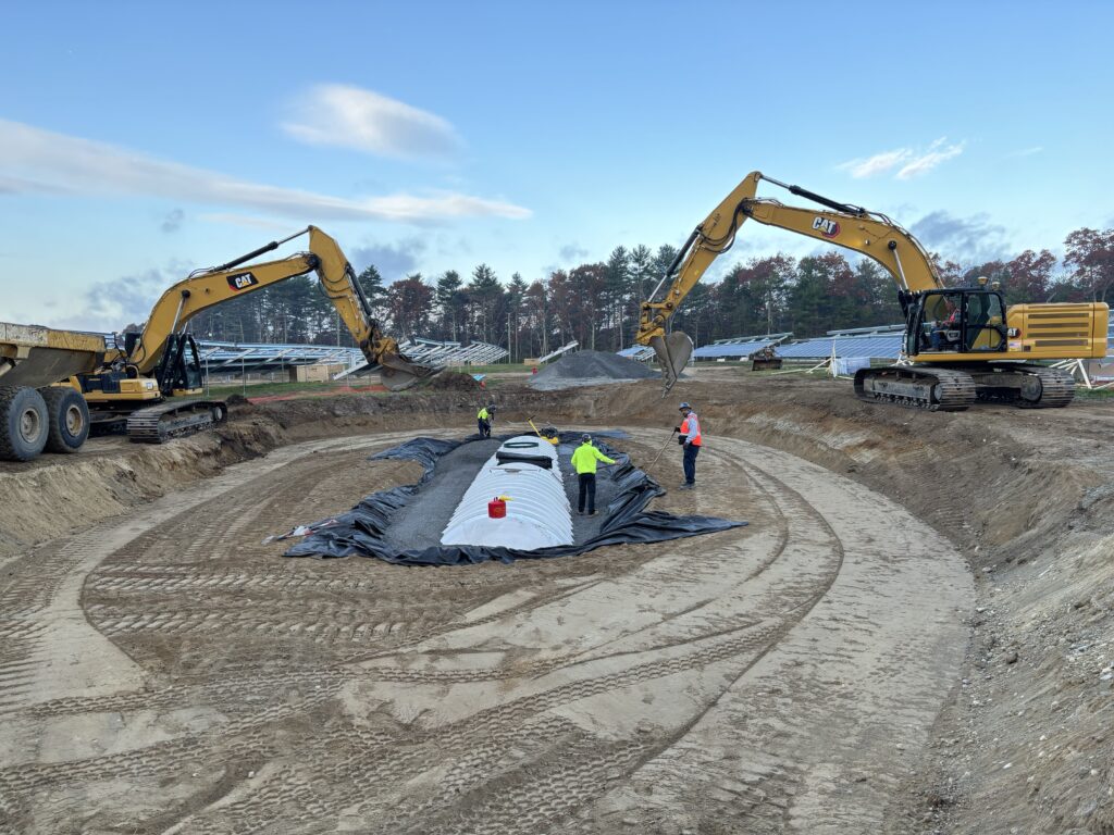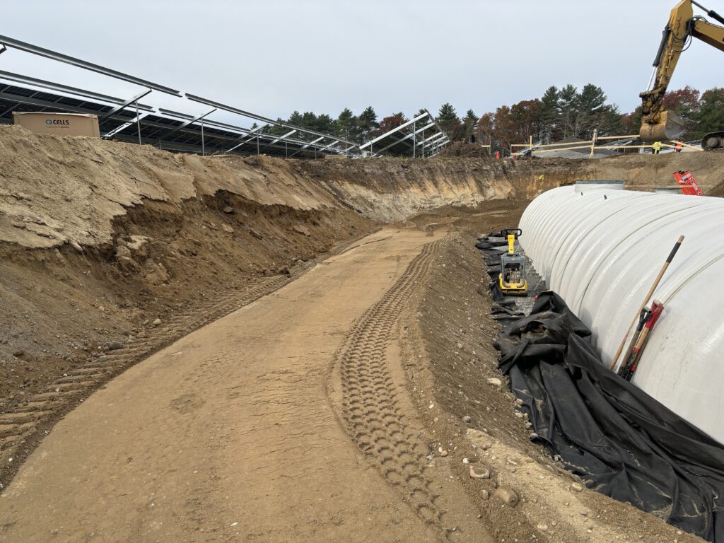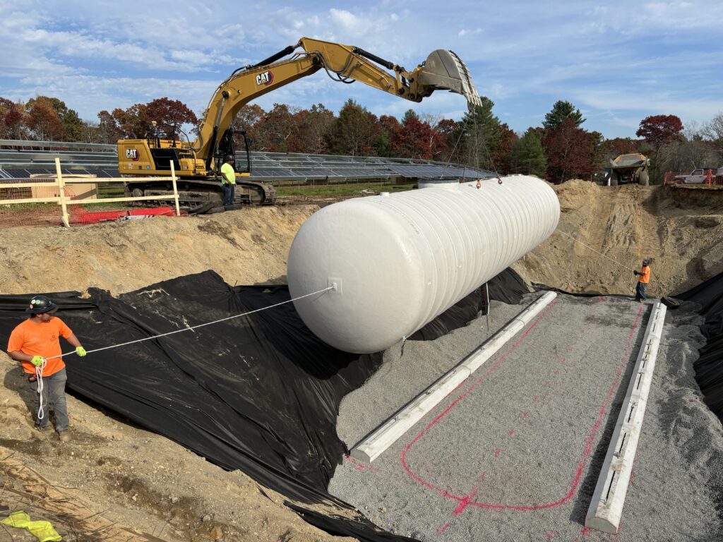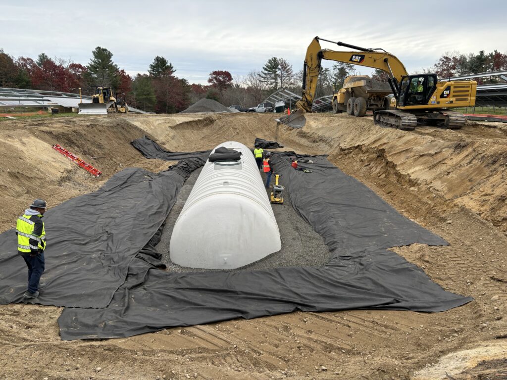 Project Description: As solar energy facilities expand across the nation, so do the fire protection requirements for these critical renewable infrastructure sites. FTS engineered and delivered a specialized fire suppression water storage solution for Rehoboth Renewables’ solar panel field in Massachusetts—addressing the unique challenges of protecting remote renewable energy installations. This single-wall underground fiberglass tank provides 30,000 gallons of dedicated fire protection water supply, designed to meet the additional demand requirements of large-scale solar arrays. The system features a complete package of custom-engineered accessories, including vent and level monitoring, dual fill and recirculating assembly for water quality maintenance, containment sump riser for leak detection, and an H-25 traffic-rated cover capable of withstanding heavy equipment loads during construction and maintenance operations. A custom-engineered deadman anchoring system ensures the tank remains secure in all soil conditions. Manufactured at our centralized facility and delivered turnkey to the remote solar site, this solution provides decades of reliable fire protection for Massachusetts’ growing renewable energy infrastructure.